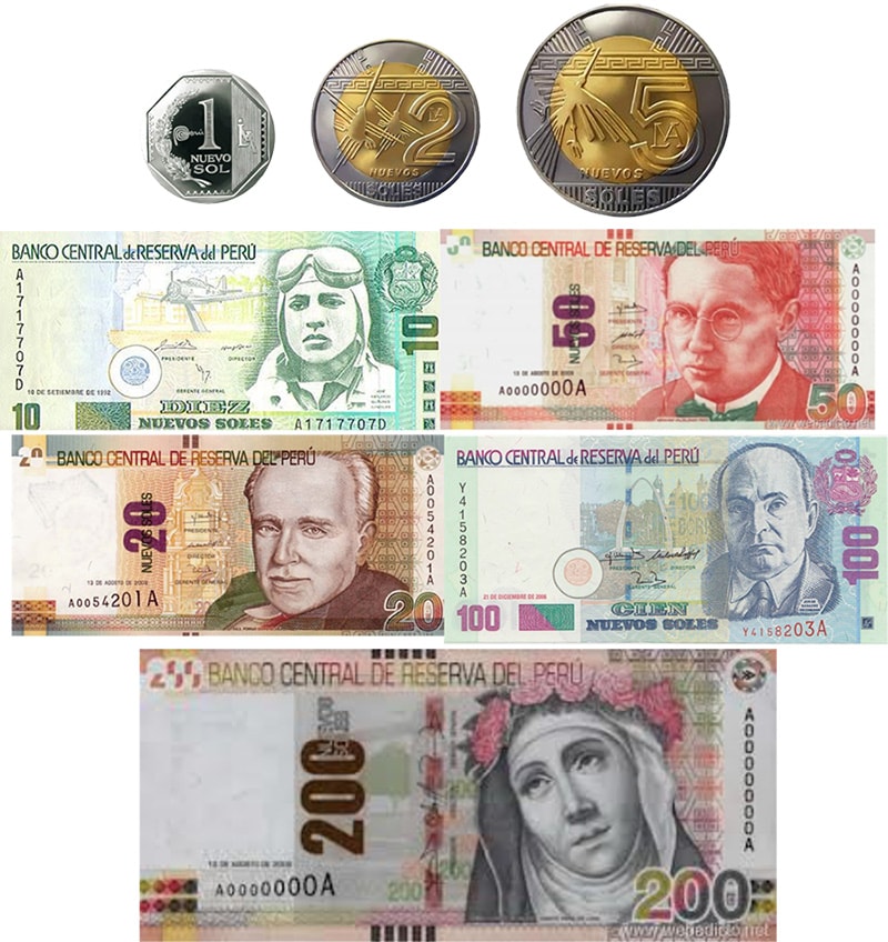 La moneda oficial de Peru es el Nuevo Sol; su símbolo es S/. Las denominaciones en circulación son: Billetes de 10, 20, 50, 100 y 200 Nuevos Soles; monedas de 1, 2 y 5 Nuevos Soles y monedas de 5, 10, 20 y 50 Centavos de Nuevo Sol. Sin embargo, el dólar Americano es ampliamente aceptado.